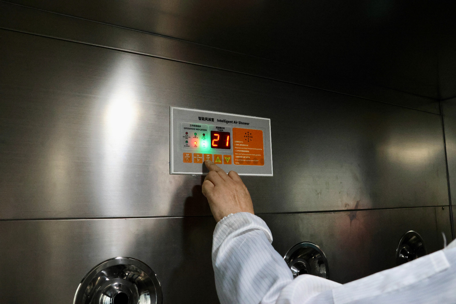 在旧厂区二楼车间,工人们都得穿无尘服、戴口罩,“全副武装”经过智能风淋室“安检”后才干“上机”操作。